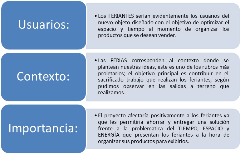 -Mejorar (disminuir) tiempo de carga y descarga, según lo que nos expusieron los feriantes, ellos se demoraban mucho tiempo en cargar y descargar sus productos de los camiones, situacion que nos llamo la atencion para poder ahondar como oportunidad de diseño.