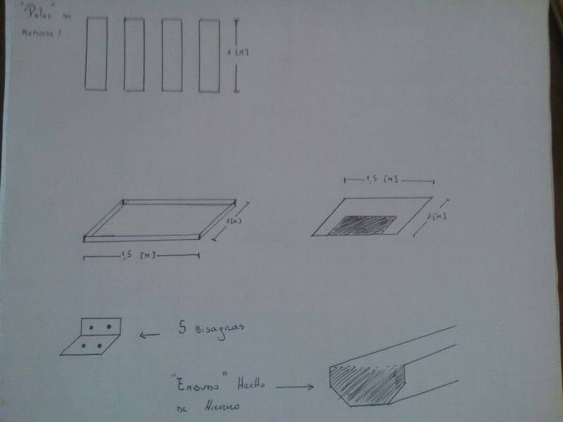 Pensamos en agregarle ruedas para poder movilizarla y en otras cosas como un resorte por ejemplo. Entonces en el momento de planificar quisimos comprar los materiales necesarios para partir construyendo nuestra mesa. Una parte del grupo iba a ir al home center a comprar los materiales que les encargamos. Estos eran: Una tabla base de 1,25m x 1,00m, 6 palos de 3m los cuales teníamos pensado en cortarlos de 85cm para que la mesa tuviera esa altura. También necesitábamos bisagras para que la mesa fuera plegable y cumpliera nuestro objetivo.